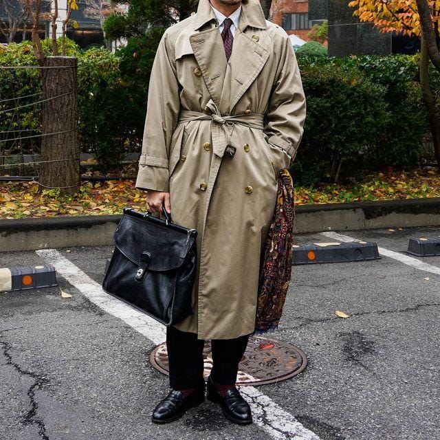 The true well-dressed gentleman understands the added panache of loosely tying the trench coat belt, as opposed to buckling it as one normally would with a belt.